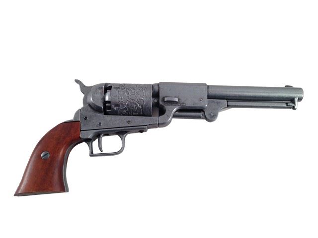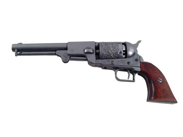 M1849 Dragoon .44 caliber revolver pistol. Made of metal and wood with engraved chamber from the set of production. Likely used as a prop reference to create the armor used in the film. (approx. 14" long)