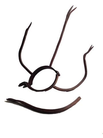 Mississippi slave screen worn, rubber shackle worn around the neck while walking through the town upon Django (Jamie Foxx) and Dr. Schultz (Christophe Waltz) entering the town on horseback. It is a collar with long metal looking (made of rubber with wiring inside) prongs that bend to form their shape, the collar is separated,one of the prongs is broken off from use during filming.(32x9)