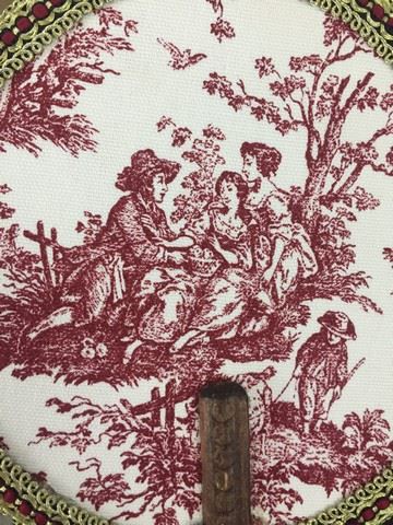 Screen used, hand held fan with custom design and hand stitching, handle is made from wood, red print on the fan of country scene.(16x7)