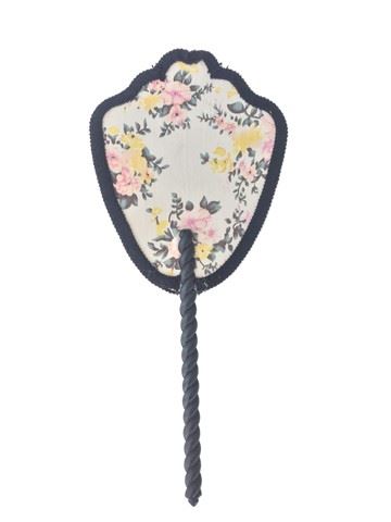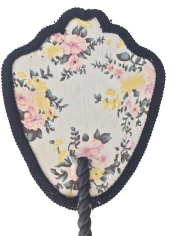 Screen used, hand held fan with custom design and hand stitching around the boarder of the fan, handle is made of wood. (20x9)