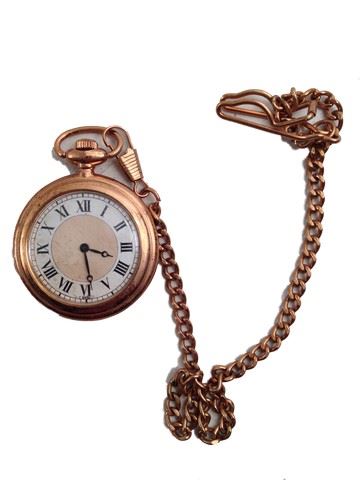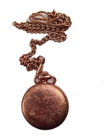 Copper pocket watch with ring on top and a chain attached chain.(2x2)
