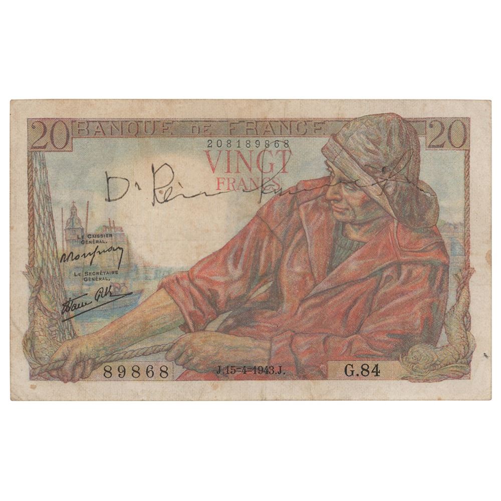 1943 Bank of France 20 Francs note, 5 x 3.25, signed in black ink, "D. Reinhardt." The front depicts a Breton fisherman wearing a red jacket and a hat pulling on the rope of a net, and the reverse shows two women with a fruit basket and a child with a Breton Calvary Statuary at right. The note bears the serial number 89868 and is series G.84. In fine condition, with some light handling wear.