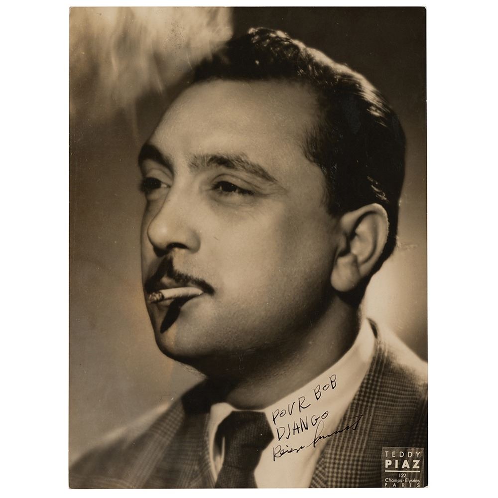 Striking vintage pearl-finish 7 x 9.25 portrait of the legendary jazz guitarist smoking a cigarette by Paris photographer Teddy Piaz, neatly signed and inscribed in fountain pen, "Pour Bob, Django Reinhardt.†In very good condition, with scattered light creasing, two light diagonal bends to the lower left, and silvering to the darker areas of the image. Accompanied by a small original 2.25 x 3 candid snapshot of the doorway of Reinhardt's club La Roulotte (marked on the reverse "Paris France, 1943, Bob Klaiss") and a letter of provenance from the former owner, noting that the signed photograph was "given to my father in Paris, France where he met Django at his club, La Roulotte, during WWII in 1943. My father, Bob Klaiss, was a professional bass player from Philadelphia, PA, playing in Army bands during the war. He has since passed, but told me what a memorable experience it was to meet and hear the famous jazz guitarist perform at his club in Paris. The additional photo shows the front entrance of La Roulotte, taken by my father, showing Django's name around the arch. My father made a note at that time on the back of this photo, 'Paris, France 1943.'"