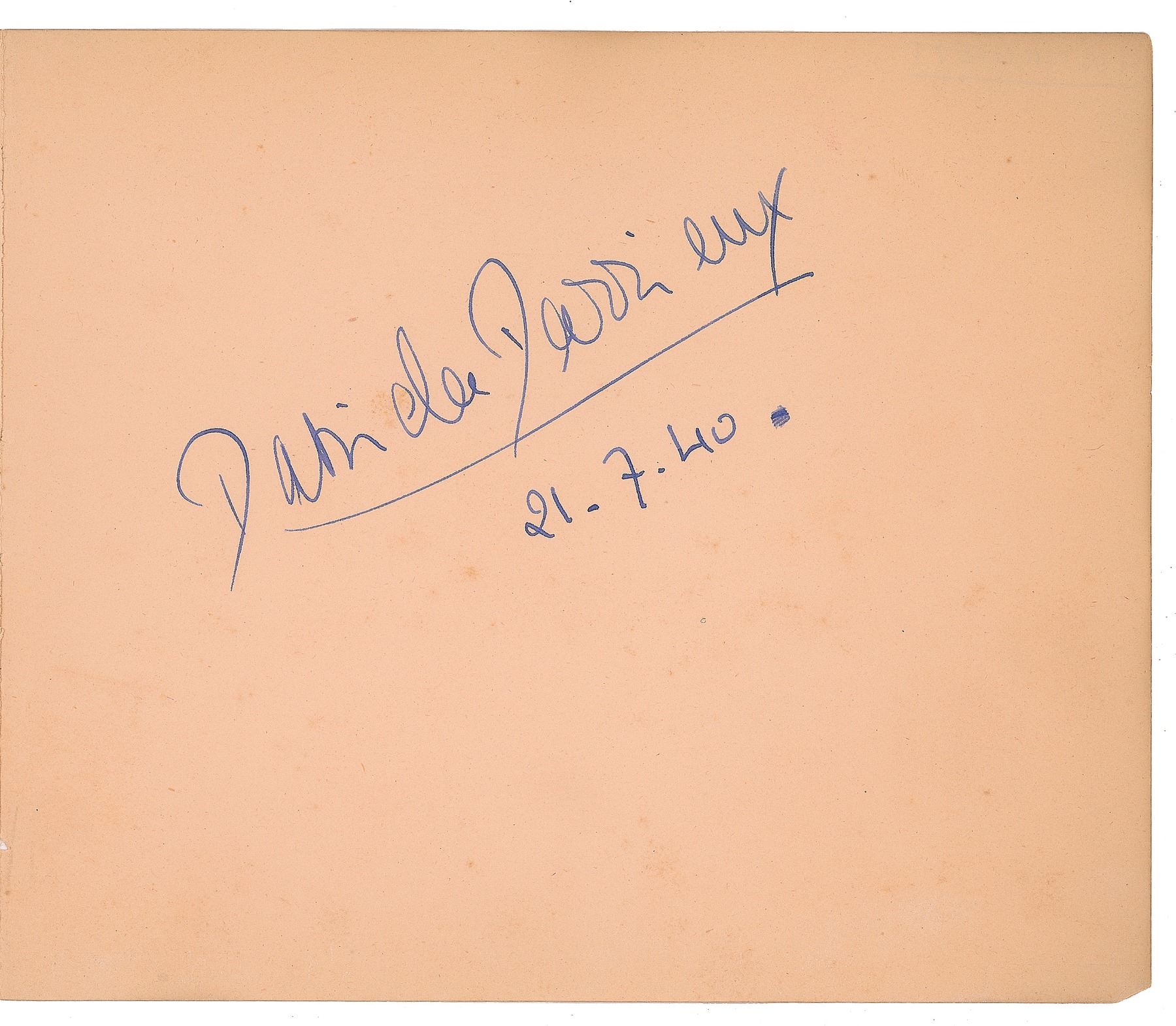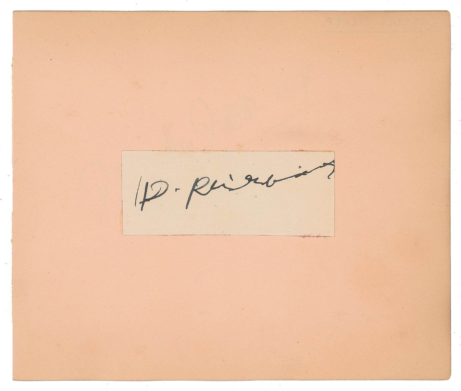Coveted vintage ink signature, "D. Reinhardt,” on an off-white 3 x 1.25 slip, which is affixed to a peach-colored 6.25 x 5.25 album page. In fine condition.