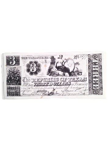 Screen used, paper money "The Republic of Texas "stack of 6 three dollar bills.(8x4)