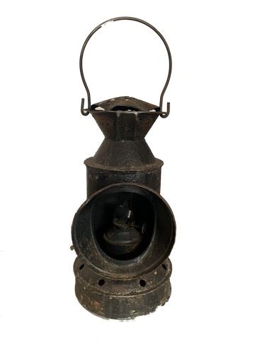 Screen used lantern made of rusted metal with an adjustable wick (approx 16" tall).