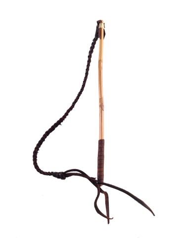Screen used, slave whip with a long wooden handle and braided leather attached, the very end has a pieces of leather tied onto the braided part that are loose strips.(50x1)