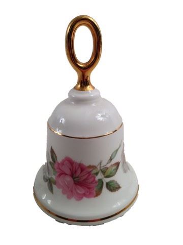 Screen used, "Royal Worchester" fine bone China servant bell, white and gold with a pink flower.(5x3)