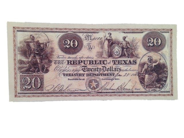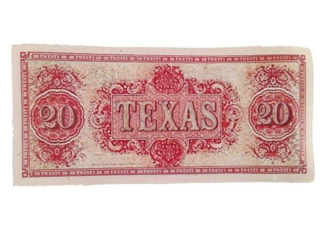 Screen used, "The Republic of Texas" 20 Twenty dollar bank note. (approx. 7" x 3") .