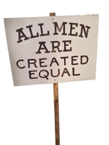 Screen used, anti slavery sign, sign reads "All Men Are Created Equal".(49x24)