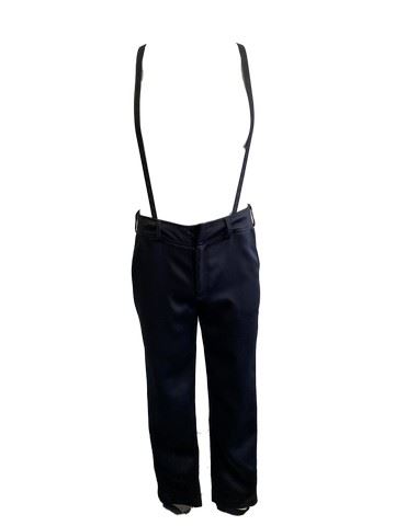 Django Unchained (2012) - Billy Crash (Walton Goggins) test, black military pants with red piping on the sides. Crossed elastic suspenders are fastened to the front and back inside with buttons. Tag says "Goggins" in marker.