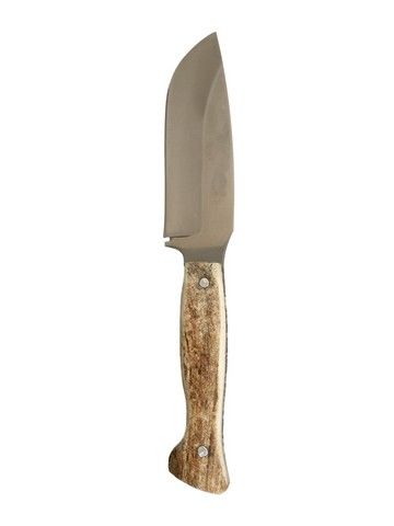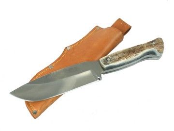 From Quentin Tarantino's newest blockbuster, "Django Unchained", this is star Jamie Foxx's hero screen worn and used "Aussie Knife" and sheath. The was custom made and designed by Master Knifemaker, Chuck Stapel, Knife Maker To The Stars™, who has, over the last thirty years, created many of the famous iconic knives seen in major motion pictures and TV series. This is the trooper field knife that Foxx "takes" from one of the Assize guards (who uses it to cut Jamie's bonds), and is then used by Foxx. This is the real thing. No stunt or rubber version was ever made. It's crafted from special heat treated high carbon 5160 steel, to a special semi-polish to cut the glare in the camera. The very unique one-of-a-kind blade styling was designed by Mr. Stapel, with further notes by Tarantino himself. The blade was crafted as one main piece with special finger guard. It has an extra thick tang, which has custom shaped and fitted naturally harvested elk antler handle plates joined with high polished aluminum rivets. The hero screen used sheath is made of real leather, with rivets and machine sewn seams, and includes a belt loop. It shows slight signs of wear from its use in the production. This is the first Stapel screen used Hero knife to ever come up for auction! It comes with a special Certificate of Authenticity signed by Mr. Stapel himself. (Knife is approx. 11" long, blade from spine to edge is approx. 2"). Be extra careful. This unique one-of-a-kind magnificent work of art is very, very sharp!