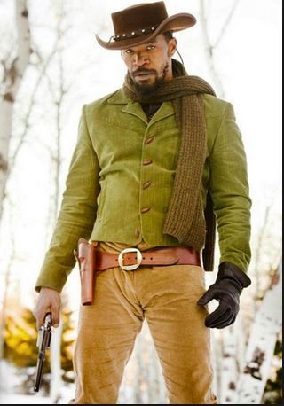 Django (Jamie Foxx) dark brown leather with metal buckle gun belt and hard leather gun holster.