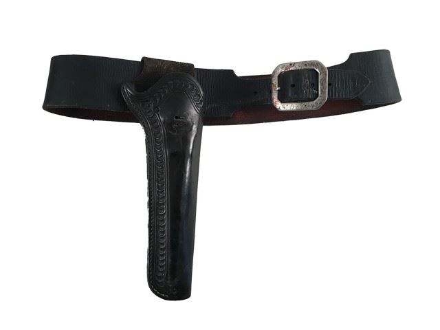 Dr. King Schultz (Christoph Waltz) screen used, worn black leather with metal buckle gun belt with hard black leather gun holster.