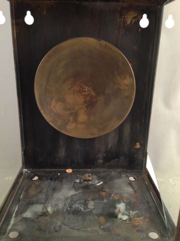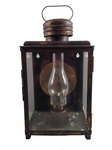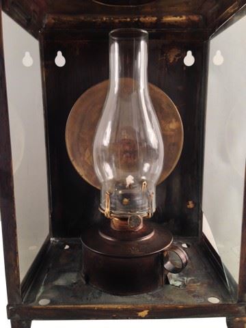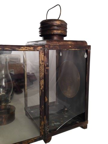 Screen used, large metal and glass lantern with removable smaller lantern. Glass door opens up to remove smaller lantern. Right side of the glass is slightly broken. Back of the lantern has holes that can be used to mount on the wall. Has a handle at the top for carrying. Round brass design on the inside for reflecting light.(21x11x8)