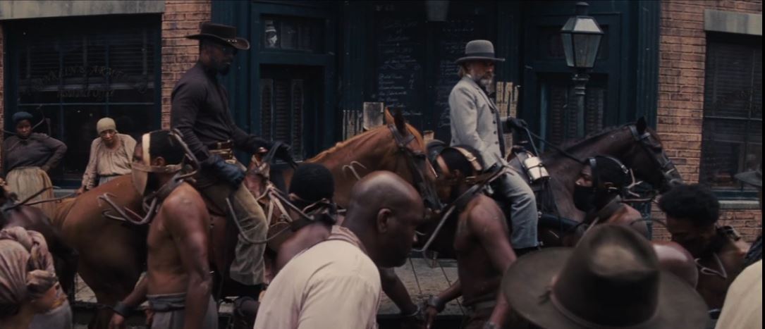 Mississippi Slave's screen worn, brown leather and aluminum face piece worn while walking through the town when Django and Dr. Schultz arrived in Mississippi.(2x3)