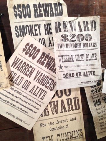 "Wanted" signs wood board used as set decoration in the film. This is a large wood board with six different wanted posters nailed onto it.(33"x35")