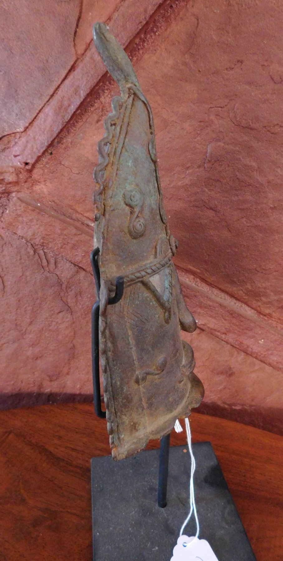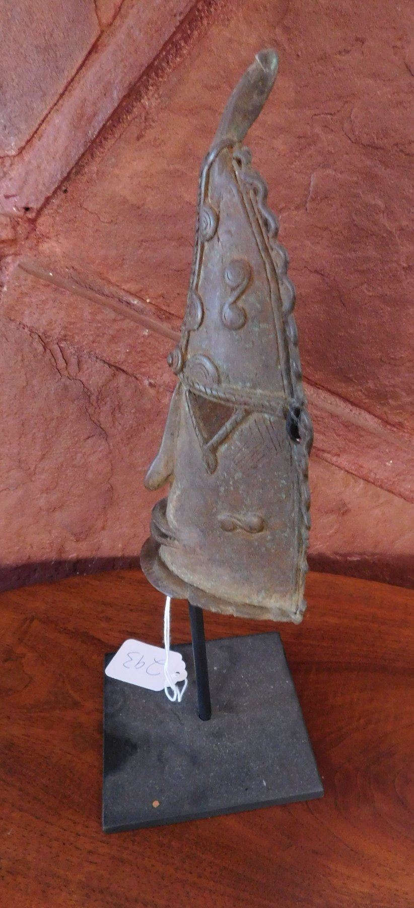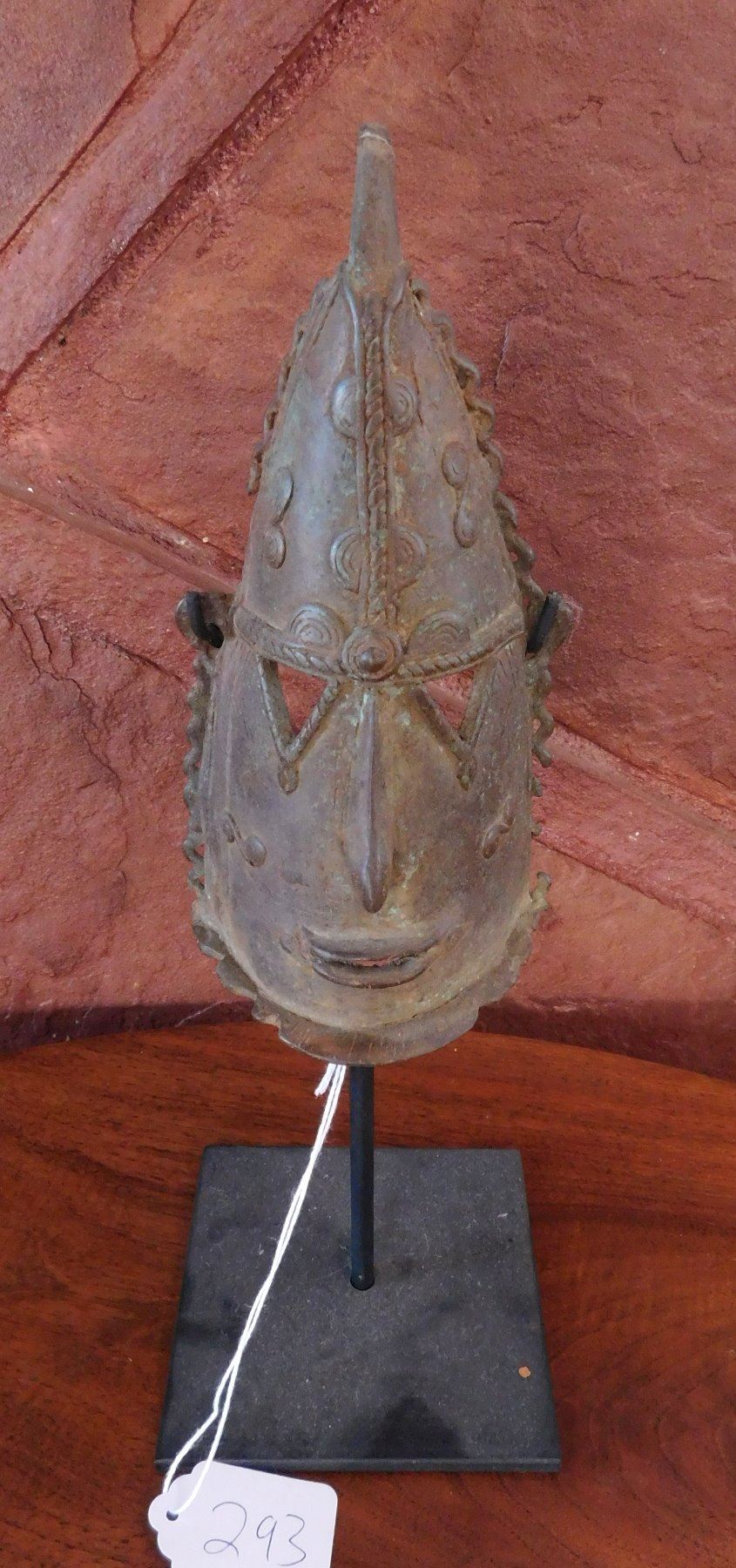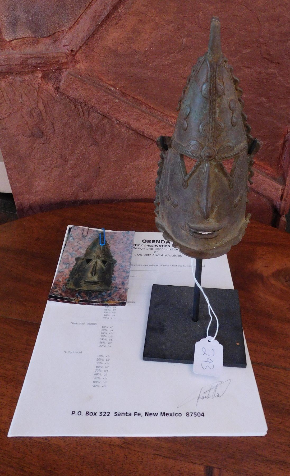 Djenne Bronze w/Report-COA, mid 19th century item. Made of bronze, the item measures 7.5" tall. Mali. Frank Aon Report/Certificate of Authenticity. Condition: Some damage to headdress, see images. Shipping: $32.50 w/insurance and signature, due to size.