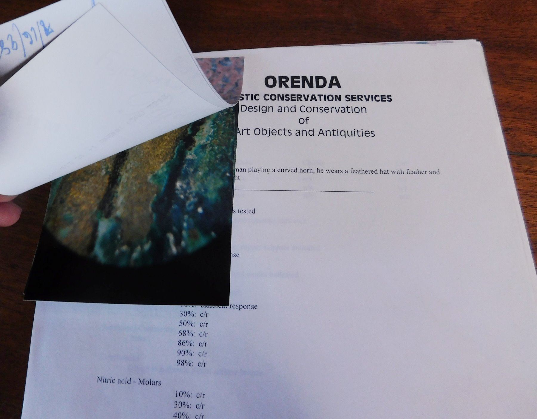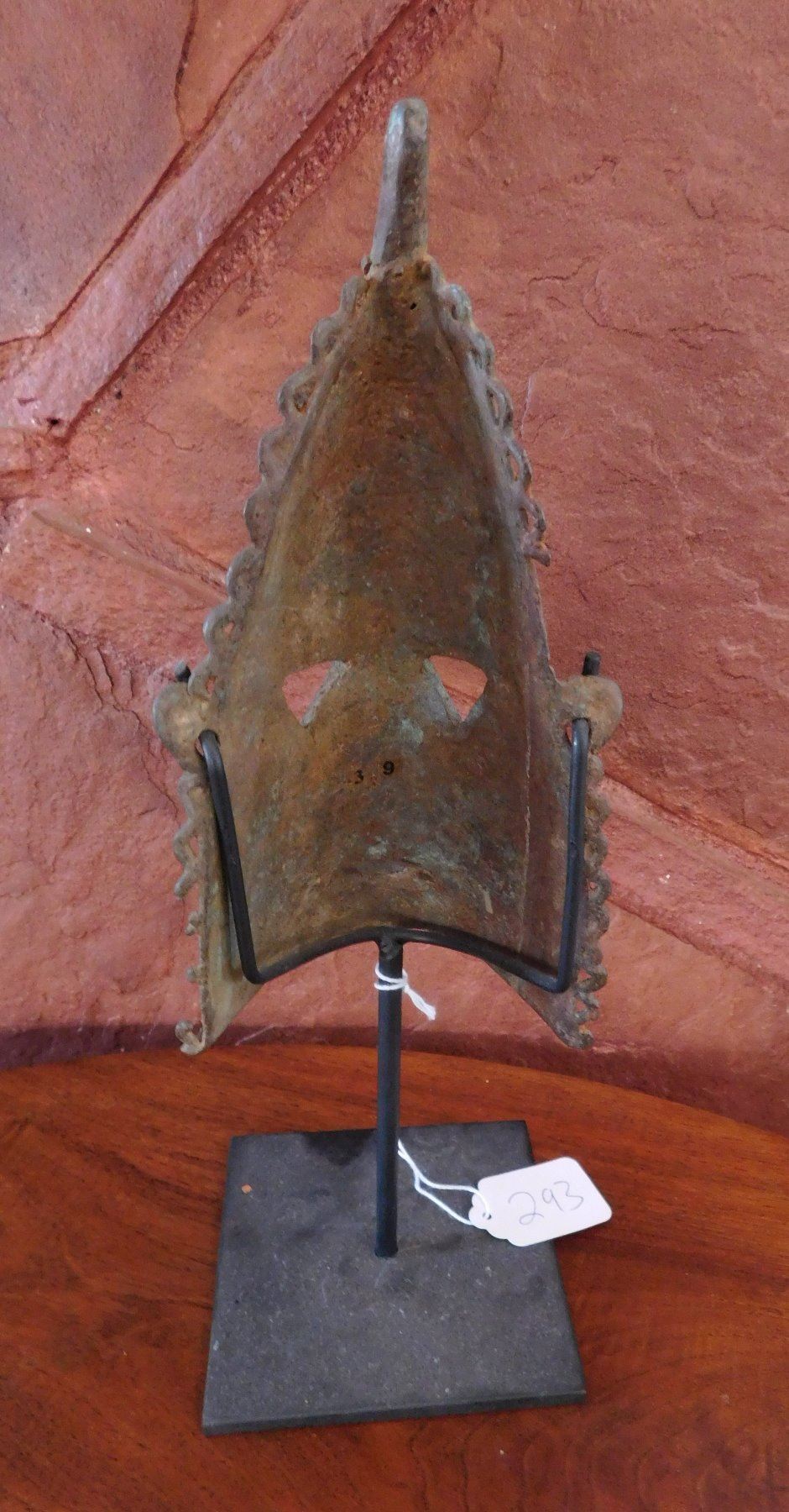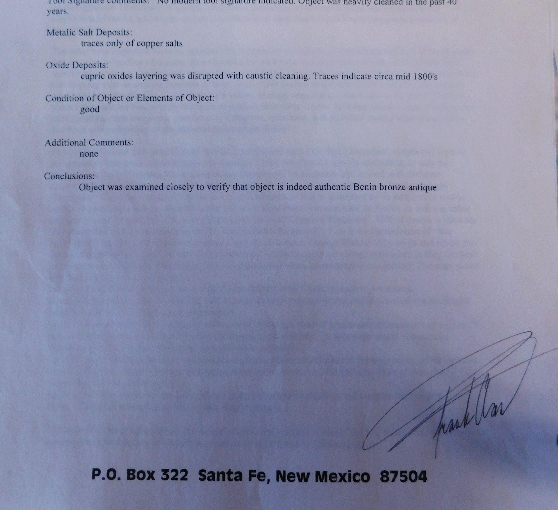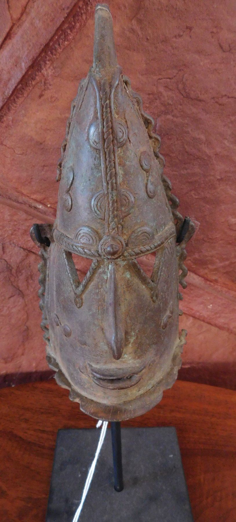 Djenne Bronze w/Report-COA, mid 19th century item. Made of bronze, the item measures 7.5" tall. Mali. Frank Aon Report/Certificate of Authenticity. Condition: Some damage to headdress, see images. Shipping: $32.50 w/insurance and signature, due to size.