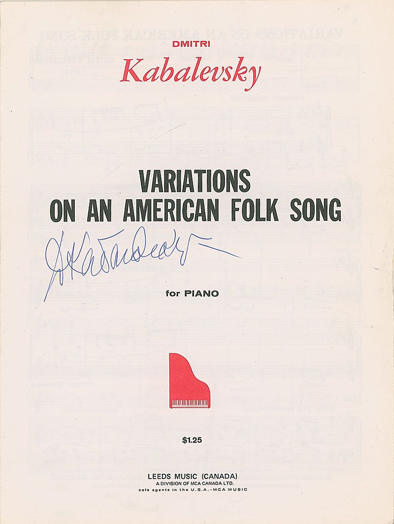 Russian composer (1904–1987) who helped to set up the Union of Soviet Composers in Moscow and remained one of its leading figures. Sheet music for ‘Variations on an American Folk Song,’ 9 x 12, eight pages, signed on the front cover in blue ballpoint, “D. Kabalevsky.” In fine condition.