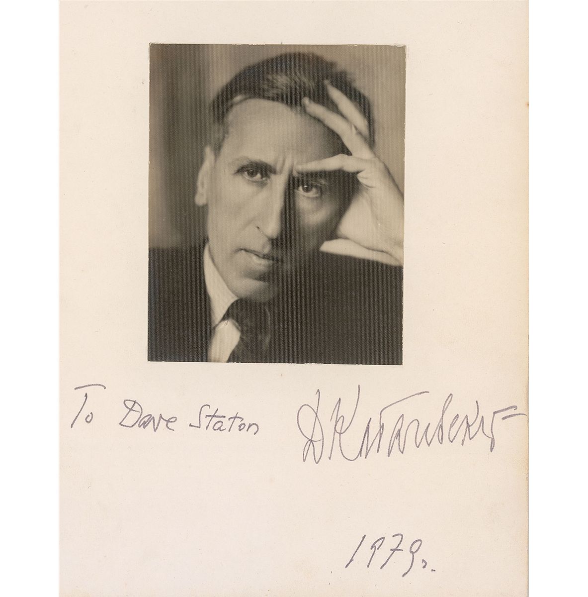 Russian composer (1904–1987) who helped to set up the Union of Soviet Composers in Moscow and remained one of its leading figures. Felt tip signature and inscription, “To Dave Staton, D. Kabalevsky 1979,” on an off-white 7.5 x 9.5 mount bearing an affixed matte-finish 4 x 5 portrait. In fine condition.