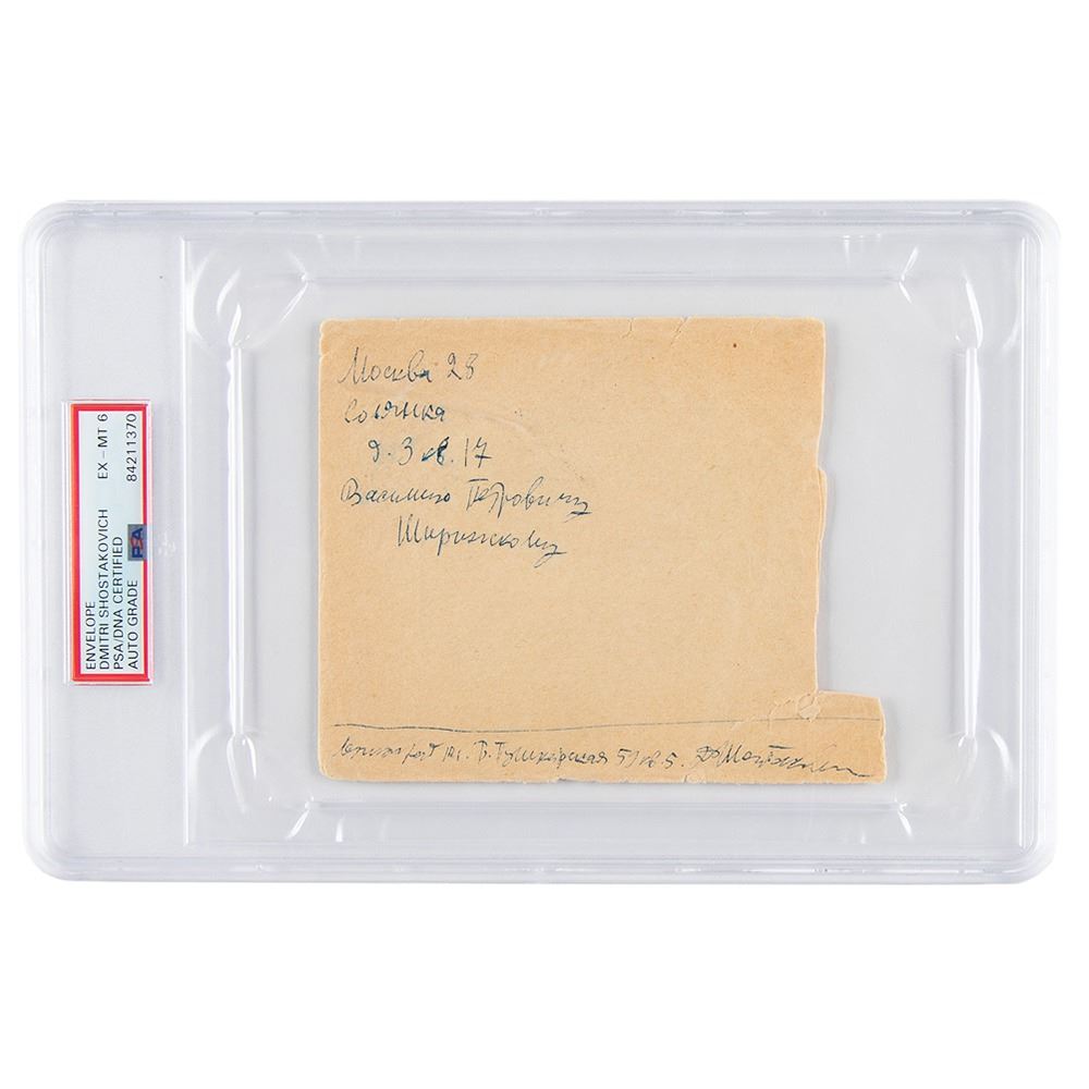 Hand-addressed and signed envelope panel, 5.5 x 4.5, addressed by Shostakovich in Cyrillic and signed as part of the return address along the bottom, "D. Shostakovich." In very good condition, with light toning and creasing, and the right edge clipped off. Encapsulated in a PSA/DNA authentication holder, grading the autograph as "EX-MT 6."