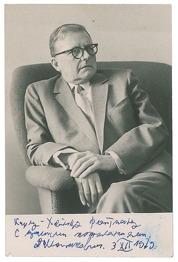 Matte-finish 4 x 6 photo of the great Russian composer in a casual seated pose, signed and inscribed in the lower border in fountain pen in Cyrillic, and dated December 3, 1969. In fine condition, with light brushing to the ink.