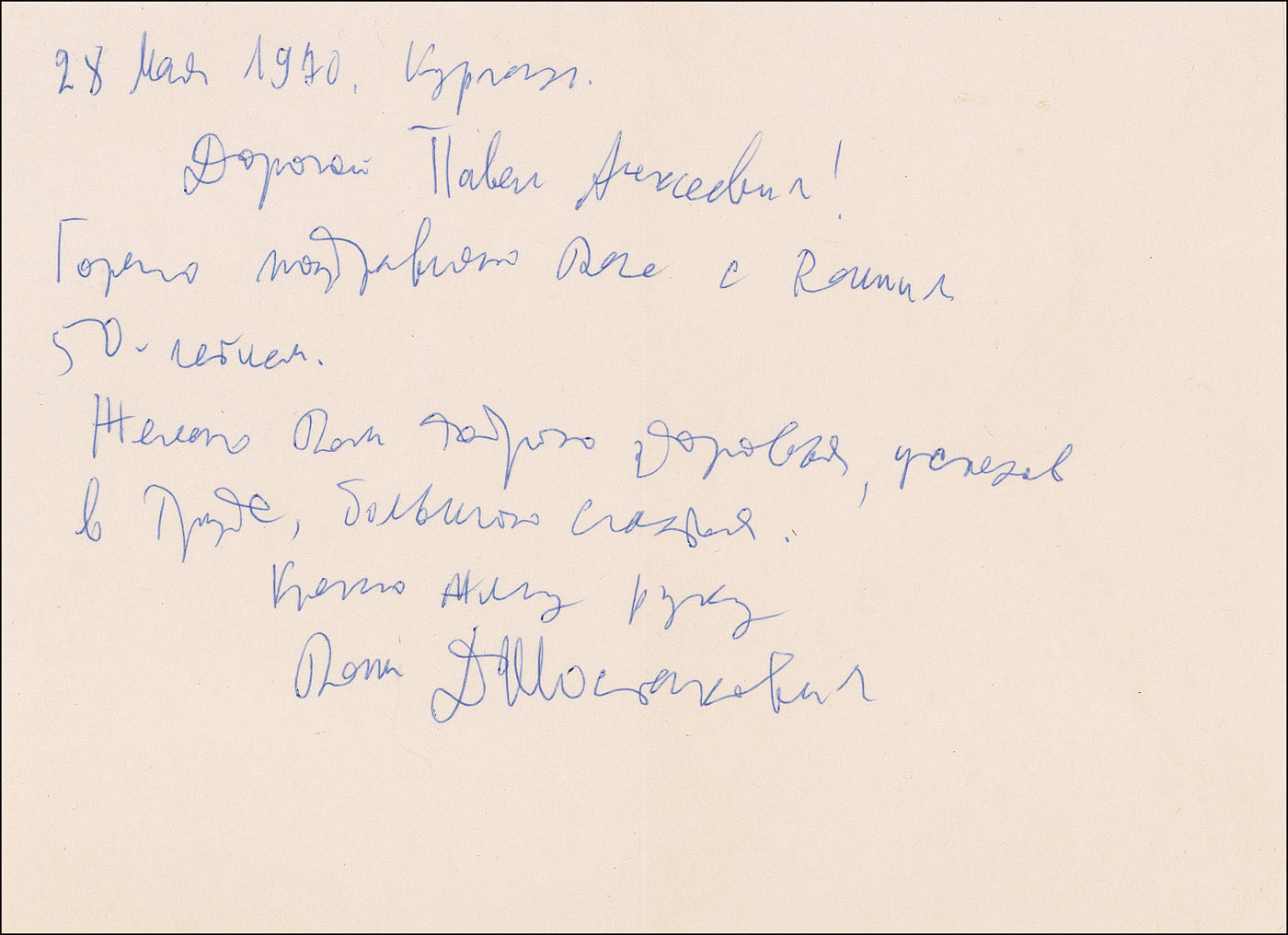 Soviet composer (1906–1975) whose fifteen symphonies occupy a place of central performance in the orchestral literature of the twentieth century. ALS in Russian, signed “D. Shostakovich,” one page, 8 x 5.75, May 28, 1970. Shostakovich sends birthday wishes to Pavel Alekseevich. In full (translated): “My warm greetings with your birthday. You are 50 years old. I wish you good health, success in your work, and happiness and good luck.” In fine condition, with a central vertical fold, one through a single letter of signature, and a few creases and wrinkles.