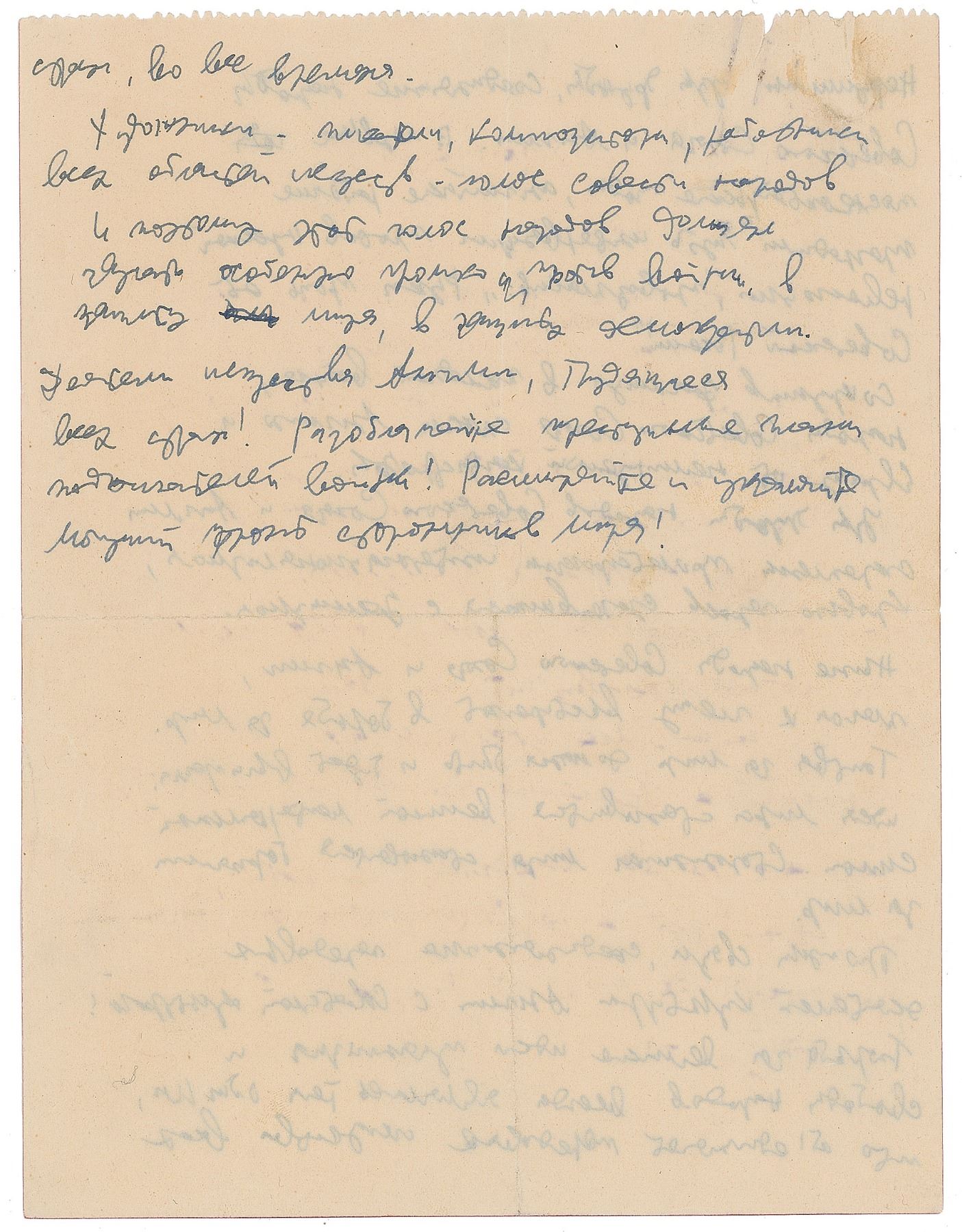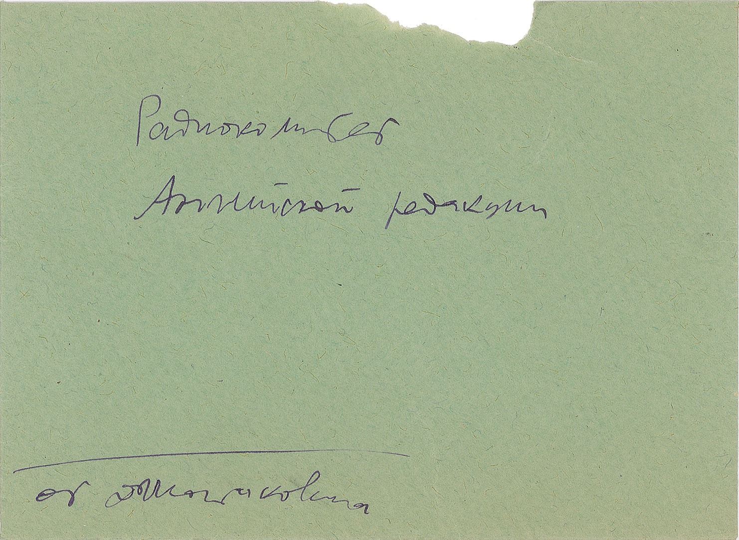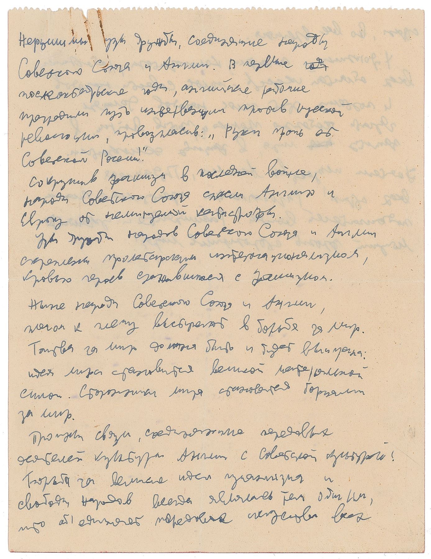 Soviet composer (1906–1975) whose fifteen symphonies occupy a place of central performance in the orchestral literature of the twentieth century. Handwritten manuscript in Russian by Shostakovich, unsigned, one page both sides, 5.75 x 7.5, circa 1950. A speech for the Sheffield World Congress of the Supporters of Peace. In part (translated): "The ties between the Soviet Union and England are unbreakable. In the first years of the revolution, English workers protested with the slogan 'Hands off Soviet Russia!' When fascism was defeated in the last war, people of the Soviet Union saved England and Europe from immanent catastrophe. Our peoples of the Soviet Union and England, shoulder to shoulder, are joining in the fight for peace…Artists, composers, writers, workers in all of the arts are the voice of consciousness of all the people, and that's why that voice should loudly rumble against the war. Under the protection of peace, and under the protection of Democracy, artists, statesmen of England, workers of all countries, expand and strengthen the powerful front of the Supporters of Peace." In fine condition, with a rusty paperclip impression to the top edge. Accompanied by the original transmittal envelope, addressed in his hand to the "Literary Bureau of Great Britain," and signed in the lower left, "D. Shostakovich."