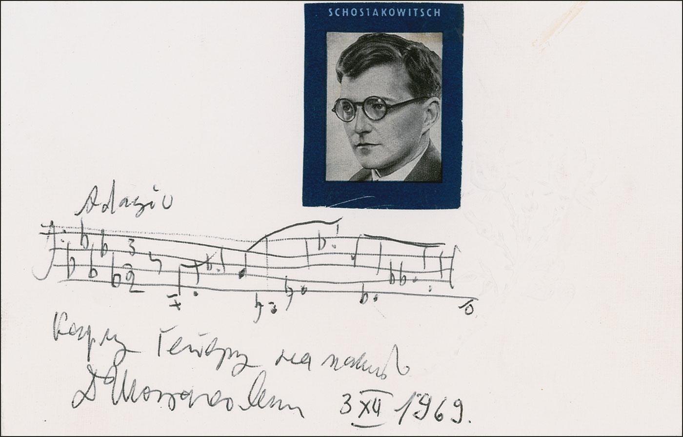 Soviet composer (1906–1975) whose fifteen symphonies occupy a place of central performance in the orchestral literature of the twentieth century. AMQS, signed “D. Shostakovich,” on an off-white 6 x 3.75 card bearing an embossed rose branch. Shostakovich pens two intricate bars of music from one of his works, and dates the quote December 3, 1969. A small photo of the composer has been affixed to top edge. Light postal impression to lower left and a trivial spot to top right, otherwise very fine, bright condition.