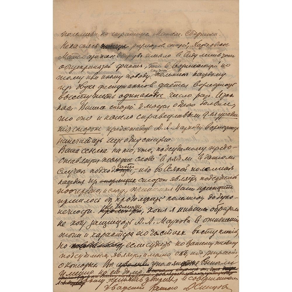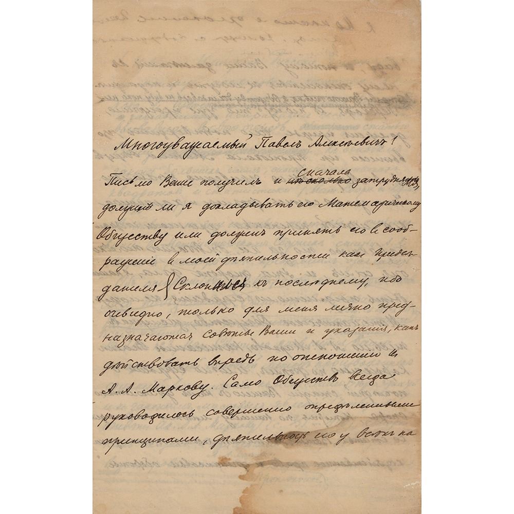 In response to this article, an article by A. A. Markov was published in the Mathematical Collection, which he intended to title 'On the discoveries of P. A. Nekrasov,' but which appeared under the title 'Reply to P. A. Nekrasov.' On this, however, the controversy ended, and in vol. 28 'Mat. Collection' appears your extensive article 'The general basic method of generating functions as applied to calculus…to the laws of mass phenomena…answer to academician A. A. Markov' (p. 351-460), which, as stated in the note on p. 351…in quoting Markov and…this article is a polemic on the pages of Mat. Collection…Your reference to the fact that 'the defendant is given the last word' is hardly suitable in this case, because in any controversy, each of the parties is the defendant in turn, and so on…In addition, although I in no way want to defend A. A. Markov in relation to the thought and nature of his private speeches, but judging by your letter, it is he who is the defendant, because the repressions you mention fell to his lot." In fine condition, with scattered dampstaining and adhesive residue to the upper half of the letter.
