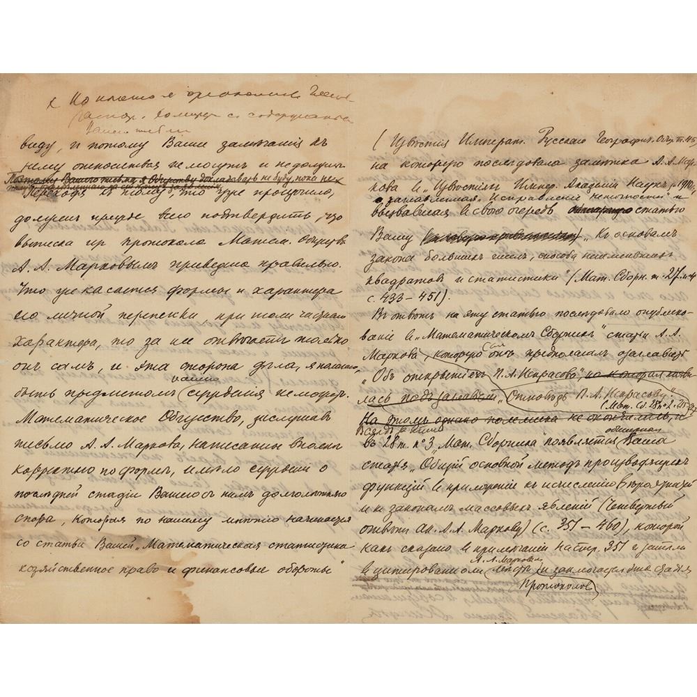 The Mathematical Society, having heard the letter of A. A. Markov, written quite correctly in form, had a judgment on the last stage of your long-term dispute with him, which, in our opinion, begins with your article 'Mathematical Statistics, Economic Law and Financial Turnovers' (Izvestiya Imperat. Russian Geographical Society, volume 45), which was followed by a note by A. A. Markov in Izvestiya Imper. Academy of Sciences in 1910, entitled 'Correction of Inaccuracies' and which, in turn, caused your article 'On the foundations of the law of large numbers, the method of least squares and statistics' (Mat. Collection vol. 27, p. 433-451).