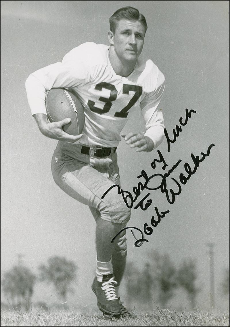 Heisman trophy winner and Football Hall of Famer (1927-1998). Glossy 5 x 7 photo of Walker running with the ball, signed and inscribed in black felt tip “Best of luck to Jim, Doak Walker.” In fine condition.