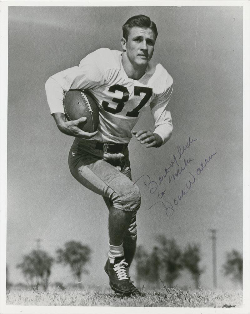 Heisman trophy winner and Football Hall of Famer (1927–1998). Glossy 8 x 10 photo of Walker running with the ball, signed and inscribed in black felt tip “Best of luck to Mike, Doak Walker.” In fine condition, with clipped return address from mailing envelope affixed to reverse.