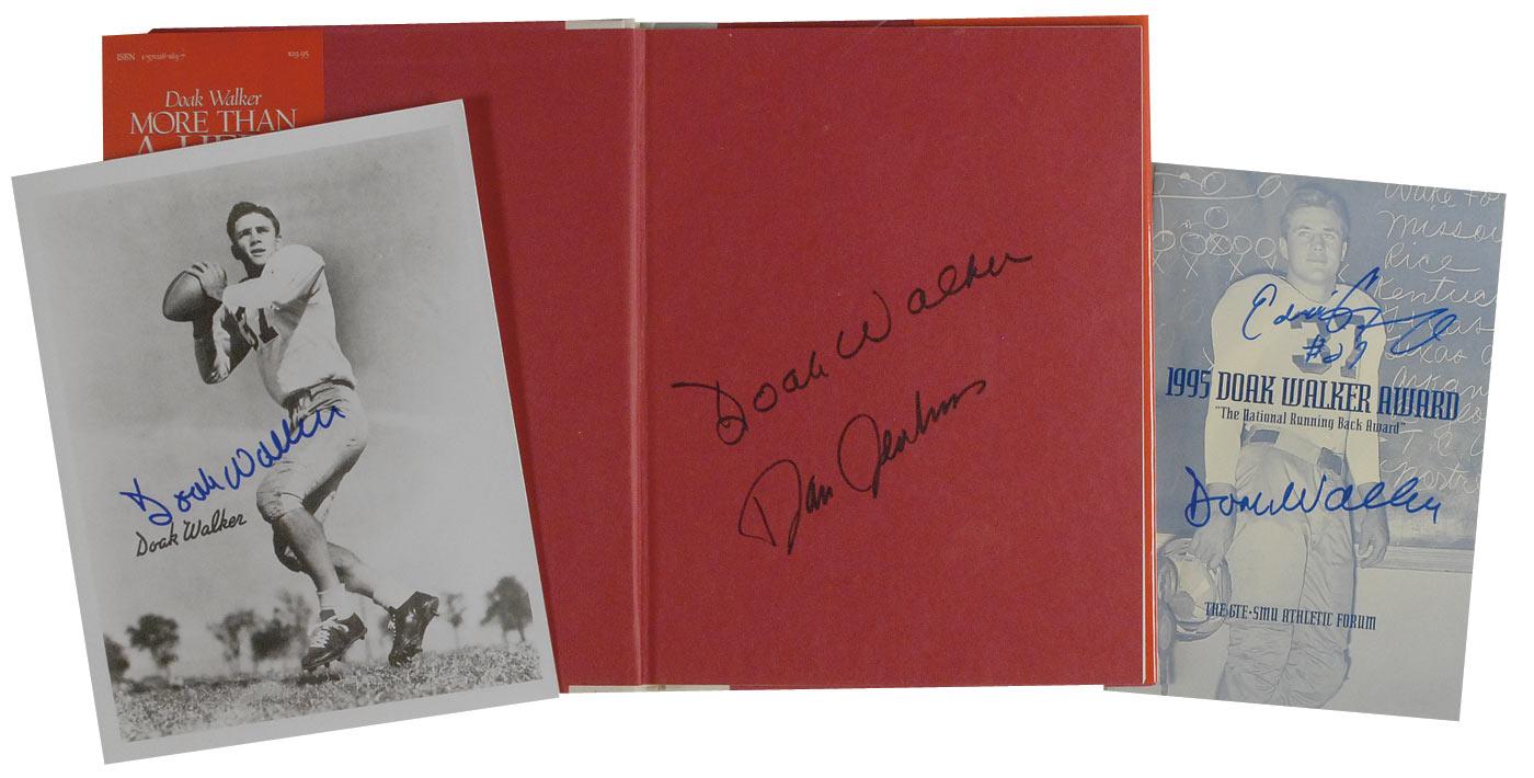 Three items: hardcover copy of More Than a Hero, signed on the first free end page by Walker and author Dan Jenkins; program from the 1995 Doak Walker Award presentation, signed on the front cover in blue felt tip by Walker and Earl Campbell; and a glossy 8 x 10 photo of Walker throwing a pass, signed in blue felt tip. In fine condition.