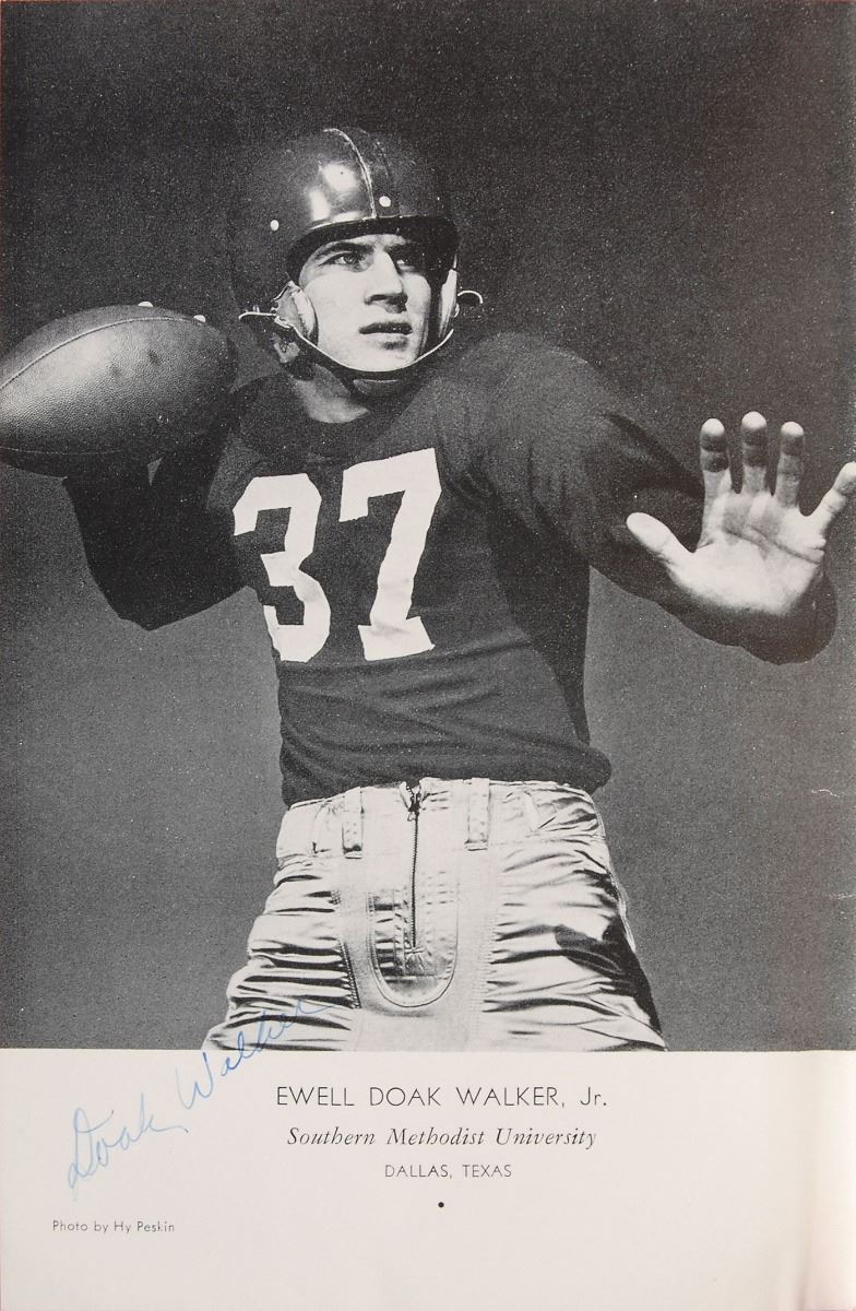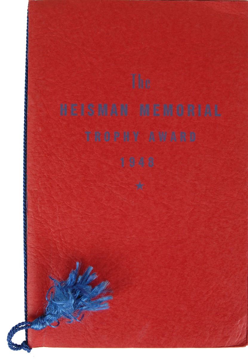Vintage program for the 1948 Heisman Memorial Trophy Award ceremony, 5.75 x 9, fourteen pages, signed below his image adjacent the title page in blue ink by Doak Walker. Includes original red cover and blue string. In fine condition. A highly appealing example doubtlessly signed by Doak at the event.