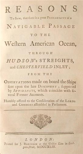 (Dobbs, Arthur). REASONS TO SHEW, THAT THERE IS A GREAT PROBABILITY OF A NAVIGABLE PASSAGE TO THE WESTERN AMERICAN OCEAN, THROUGH HUDSON'S STREIGHTS, AND CHESTERFIELD INLET, FROM THE OBSERVATIONS MADE ON BOARD THE SHIPS …….. London: for J. Robinson 1749 23pp. Bound in modern three-quarters red calf & marbled boards. Very good & clean.