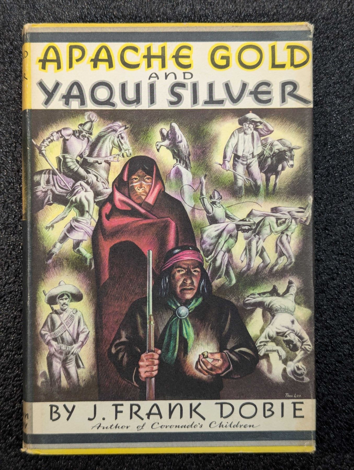 Dobie, J. Frank. APACHE GOLD & YAQUI SILVER. Little, Brown and Company, Boston. 1939. 8vo. (2), xvii, (1), 366, (2) pages. original russet cloth, gilt, jacket. Sixteenth printing. Frontispiece. Illustrated. English text. Near Fine. This book is a collection of tales of treasure hoards and lost mines as researched by the author. This is a classic book on American West lost mines and hidden treasure that includes much background on the Lost Adams Diggings and the Lost Tayopa Mine in Old Mexico. Lot weight: 1 lbs 11oz. Subject(s): Buried Treasure, Lost Mines.