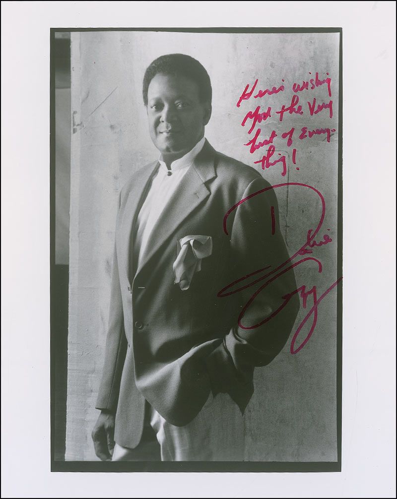 Glossy 8 x 10 publicity photo, signed in red felt tip, “Here’s wishing you the very best of everything! Dobie Gray.” In fine condition, with some light contrast to the signature.