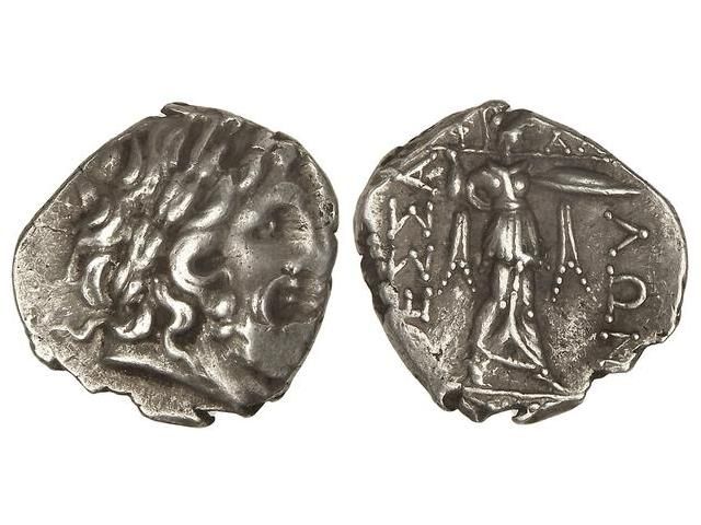 Doble Victoriato. 196-146 a.C. LIGA TESALICA. Anv.: Cabeza de Zeus laureada a derecha. Rev.: Atenea Itonia con lanza y escudo a derecha, alrededor leyenda. 6,33 grs. (Cospel parcialmente faltado). Se-2232. MBC+.