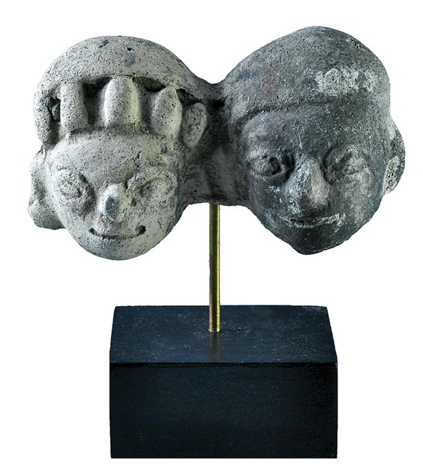 Doble cabecita. Cultura Tumaco-tolita (siglo I aC.-III d.C. Terracota. Altura 4,0 cm. Representa la cara de un hombre en transformación a jaguar. Procedente de la colección del joyero barcelonés Octavio Sardà. Adquirida en 1960's. Incluye peana.