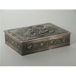 Ezüst, 507 g. Téglalap forma, cizellált díszítéssel, zsanérosan nyíló rokokó jelenetet ábrázoló fedéllel. Jelzett: magyar, XX. sz.
