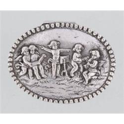 német, 20. sz. eleje, ezüst, 1925 utáni osztrák behozatali jeggyel, öntött, fedelén zenélo puttók, 46,7 g; 2*6,5*4,5 cm