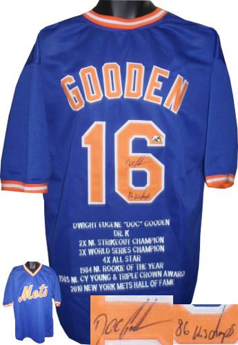 Dwight Gooden was a 4 time All-Star selection and 3 time World Series champion. He won the 1985 NL Cy Young Award and the 1984 NL Rookie of the Year. On May 14, 1996 he pitched a No- Hitter with the New York Mets. Dwight "Doc" Gooden New York Mets has hand autographed this unlicensed TB custom-prostyle Blue jersey with twill stitched nameplate and numbers with 86 WS Champs inscription and with embroidered stats. MAB Hologram and Certificate of Authenticity from Athlon Sports.