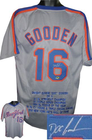 Dwight Gooden was a 4 time All-Star selection and 3 time World Series champion. He won the 1985 NL Cy Young Award and the 1984 NL Rookie of the Year. On May 14, 1996 he pitched a No- Hitter with the New York Mets. Dwight "Doc" Gooden New York Mets has hand autographed this unlicensed TB custom-prostyle Gray jersey with twill stitched nameplate and numbers with embroidered stats. MAB Hologram and Certificate of Authenticity from Athlon Sports.