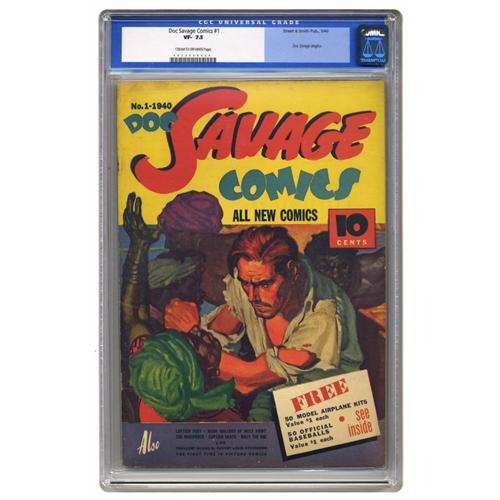 <B>Doc Savage Comics #1 (Street & Smith, 1940) CGC VF- 7.5 Cream to off-white pages.</B></I> Doc Savage is generally considered to be America's first superhero, and much about the character influenced the costumed heroes of the comics (he had a utility belt, a gadget-equipped car, a Fortress of Solitude, etc. etc.). So it was only right that the Doc got a comic book series of his own. This first issue began by adapting the novel "The Land of Terror" by Lester Dent (writing as "Kenneth Robeson"). Also appearing in this comic were a number of other pulp stars, most notably Walter Gibson's Norgil the Magician. A great painted cover leads off the issue. Overstreet 2006 VF 8.0 value = $3,395. CGC census 3/06: 1 in 7.5, 3 higher.