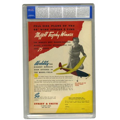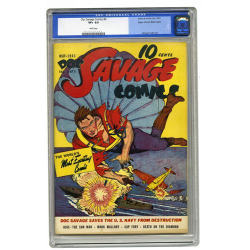 <B>Doc Savage Comics #4 Mile High pedigree (Street & Smith, 1941) CGC VF+ 8.5 White pages.</B></I> Although not graded as high as some of the other Mile Highs thanks to a small chip missing from the bottom center, this Edgar Church copy is still the highest-graded that CGC has certified to date. George Tuska has been credited with providing art for the issue. The cover bears the tiny signature "H 'A' C" -- since the only person we know of who put his middle initial in quotation marks that way was funnybook impresario Harry "A" Chesler, we can only assume that a Chesler studio staff artist was responsible for the cover art. Overstreet 2006 VF 8.0 value = $650; VF/NM 9.0 value = $1,025. CGC census 3/06: 1 in 8.5, none higher.
