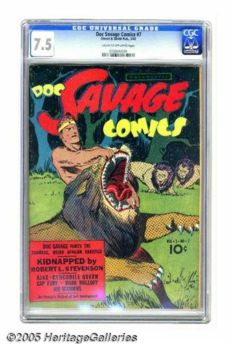 <B>Doc Savage Comics #7 (Street & Smith, 1942) CGC VF- 7.5 Cream to off-white pages.</B></I> Overstreet 2005 VF 8.0 value = $388. CGC census 5/05: 2 in 7.5, 1 higher.