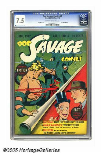 <B>Doc Savage Comics #8 (Street & Smith, 1942) CGC VF- 7.5 Cream to off-white pages.</B></I> This is the highest-graded copy of this issue that CGC has certified as of this writing. Includes a backup feature on Charlie McCarthy. Overstreet 2005 VF 8.0 value = $388. CGC census 5/05: 1 in 7.5, none higher.