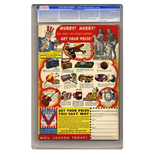 <B>Doc Savage Comics V2#2 Mile High pedigree (Street & Smith, 1943) CGC NM+ 9.6 White pages.</B></I> Here's how old this comic is: when it came out, George Burns was only 47! A feature on Burns and his better half Gracie Allen shares space with rough-and-tumble Doc Savage action in this issue. Overstreet 2005 NM- 9.2 value = $650. CGC census 12/05: 1 in 9.6, none higher.